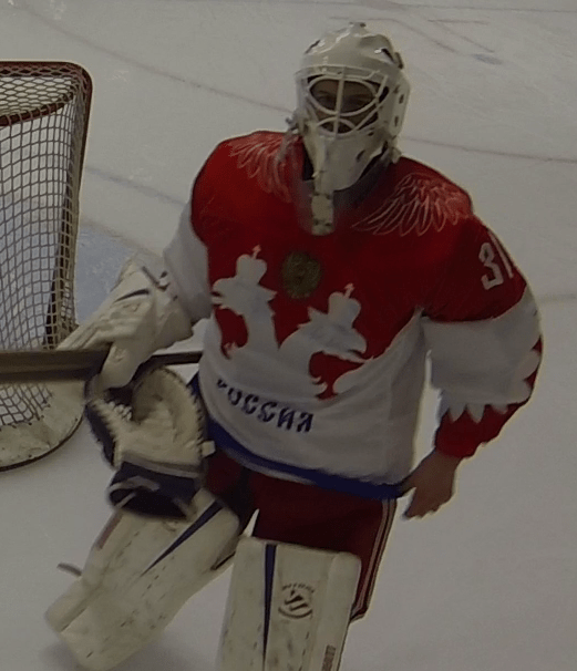 Player coming in alone again, no real threat to the middle and he is so high and away even if I go down I feel I can recover to be set and square to a shot from the middle. I cover the angle fairly aggressively and drop into the butterfly to take away holes. This team seemed to shoot for the inside of my blocker a lot, so perhaps I was giving them some space blocker side, but it explains for the poor rebound control again here.