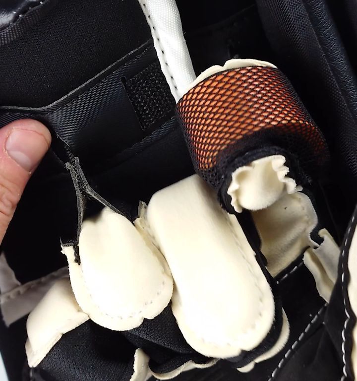 This design and connection point allows the fingers to uniformly pull down the finger protection without pulling the fingers to the sides so the gussets end up rubbing against the stick.