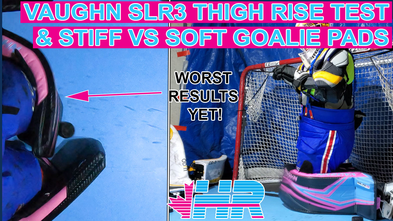 Luckily, when I ordered my Vaughn SLR 3 Pro Carbon pads, I mistakenly got one pad with the stock soft flex and one pad with the stiff flex I ordered. This allowed me to put the stiff and soft pads side by side with the puck machine to show how important thigh stiffness is.