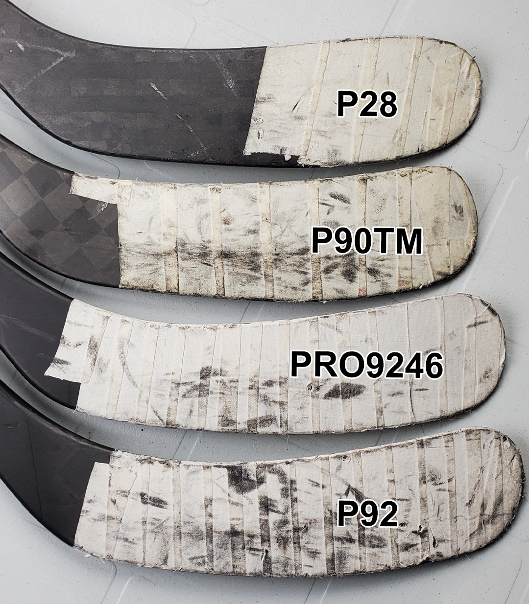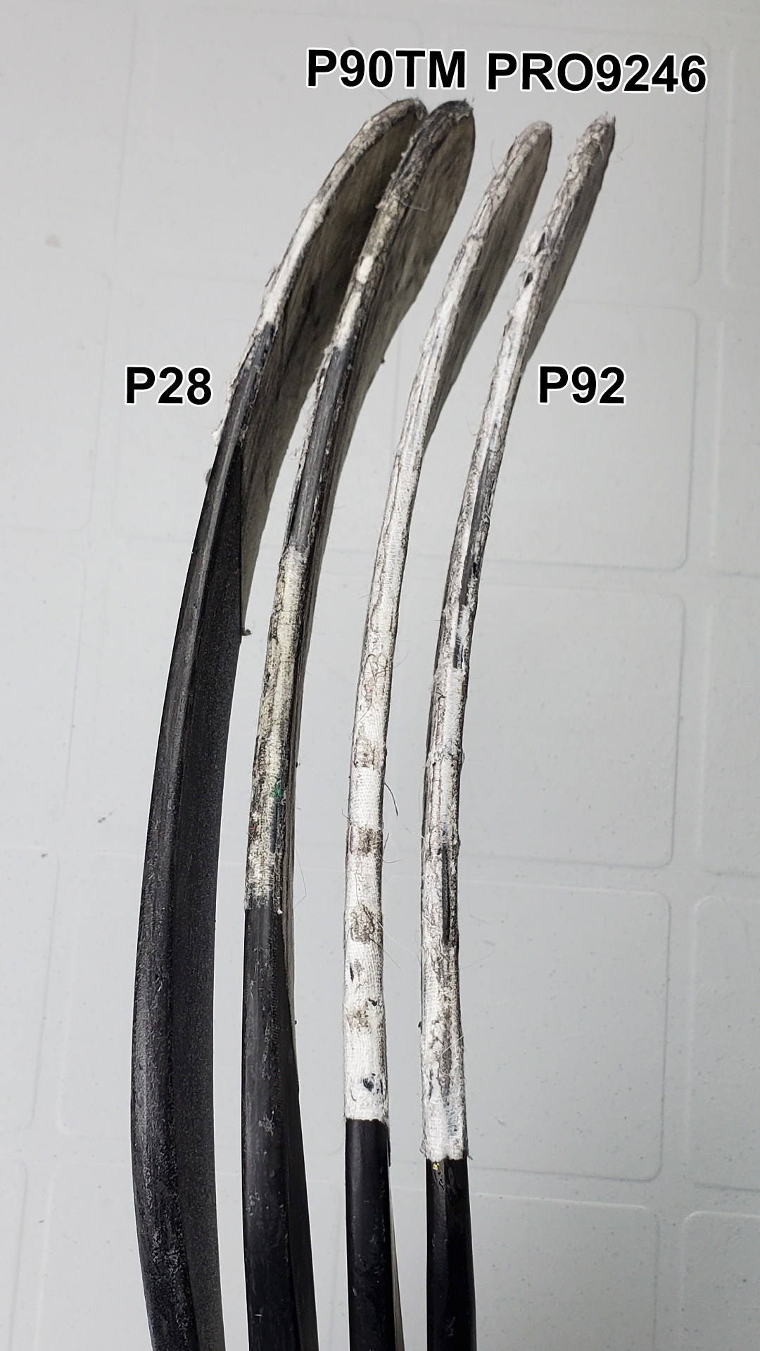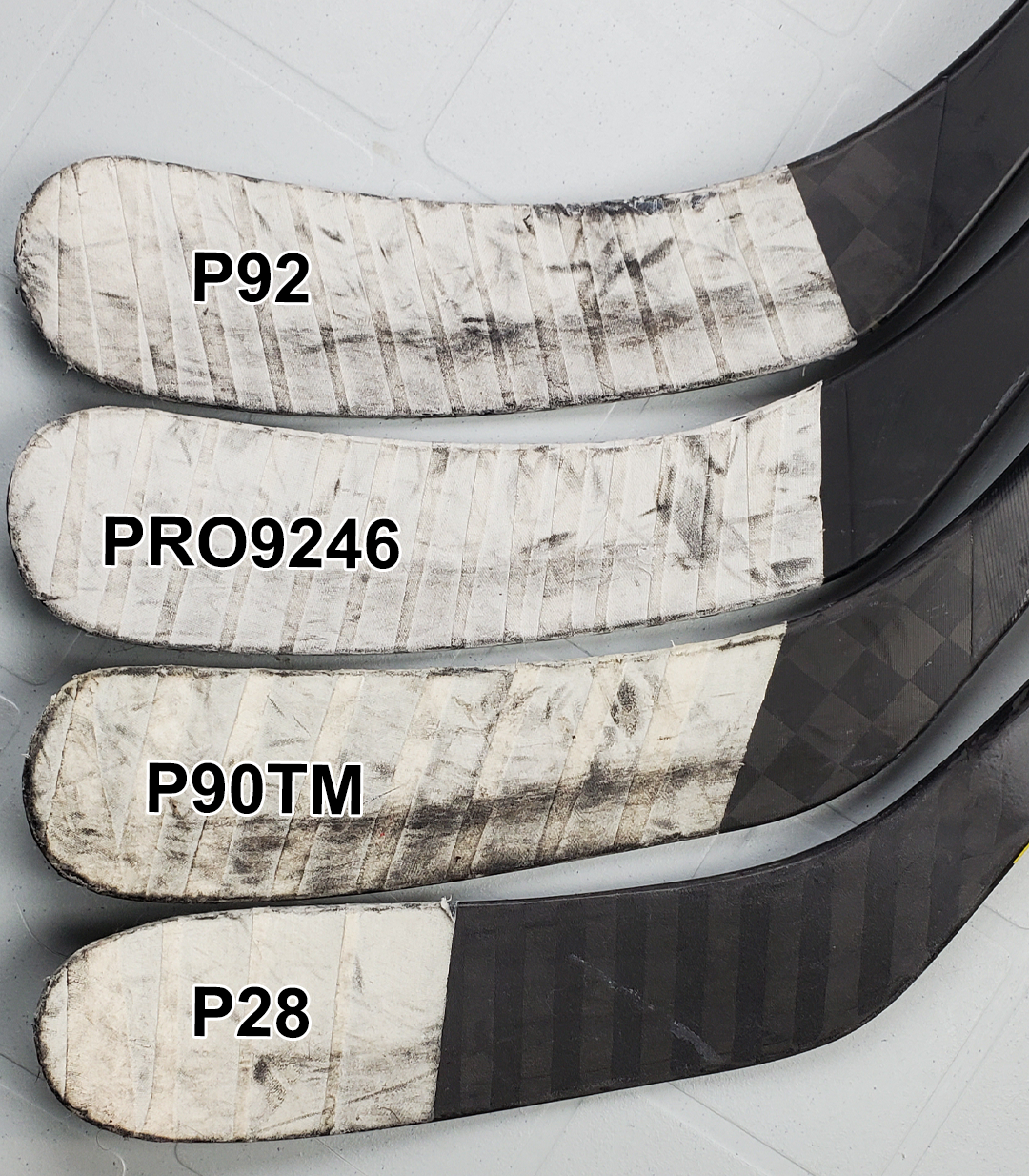 The rocker is the other big difference between the P28 and P92 curves. With the P28 being considerably more flat. Once again this is completely a personal preference thing! I prefer a more rounded and flatter style of rocker so the blade doesn’t “get in the way” when reaching out or pulling the stick in to receive a pass or to try and poke away the puck. I find that often times the toe of the P28 rocker style raises off the ice too much when I am trying to reach for a puck or break up a pass. Where the rounded bottom of the PRO9246 and P92 help with enough blade contact to grab and deflect pucks more easily.