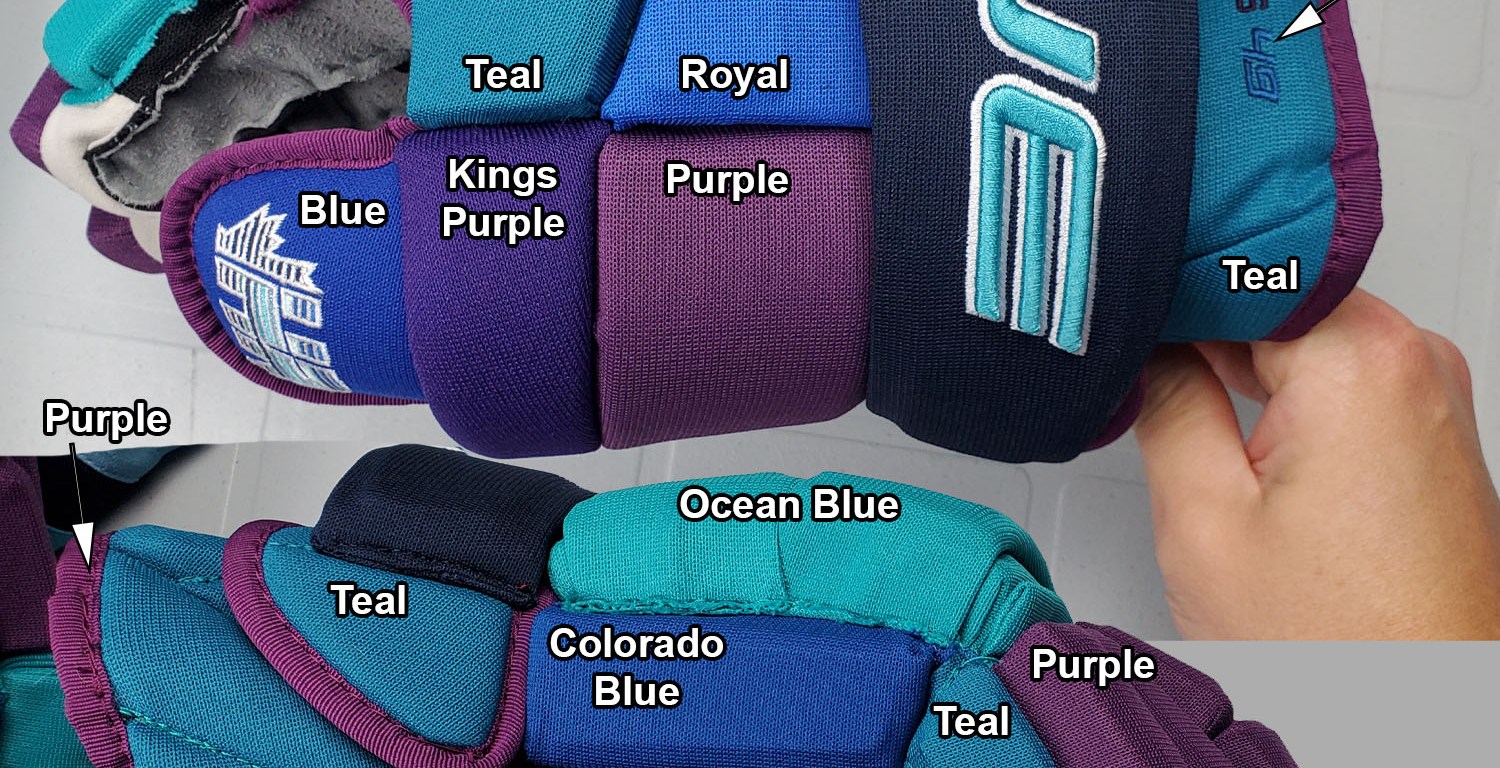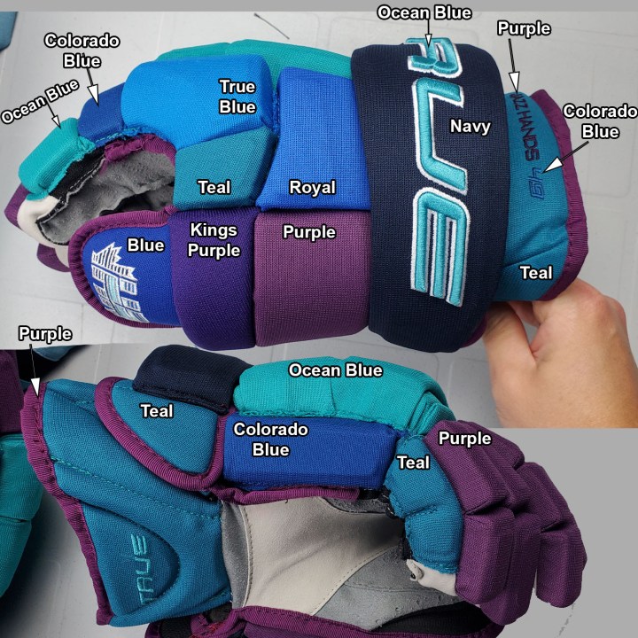 When I had the chance to order a custom pair of gloves… I figured why not order all of the blue colours (just like I did with my custom True goalie pads!). Since I selected so many below will be a guide of what each colour is! You can customizes these specific gloves here at Pure Hockey!